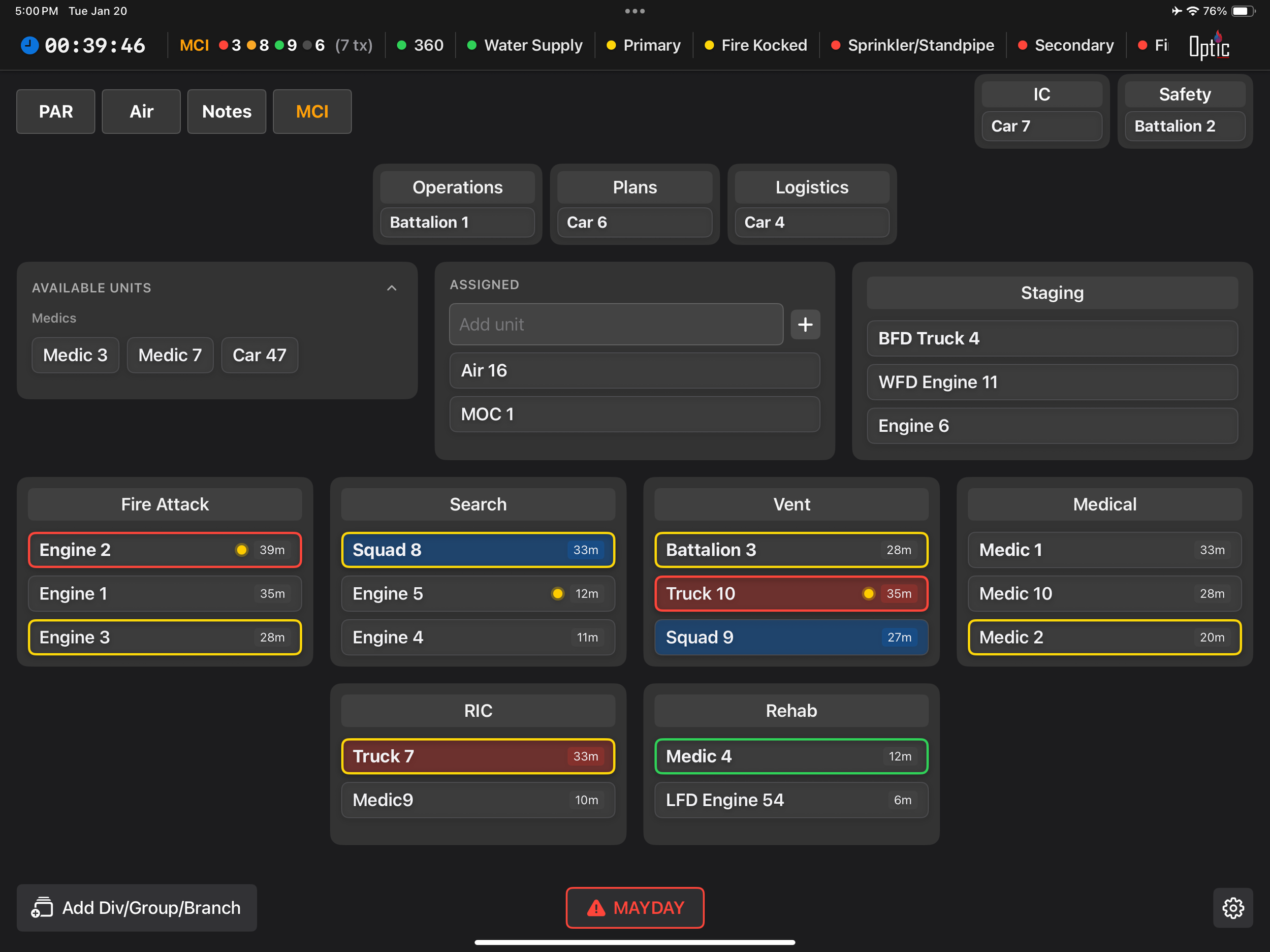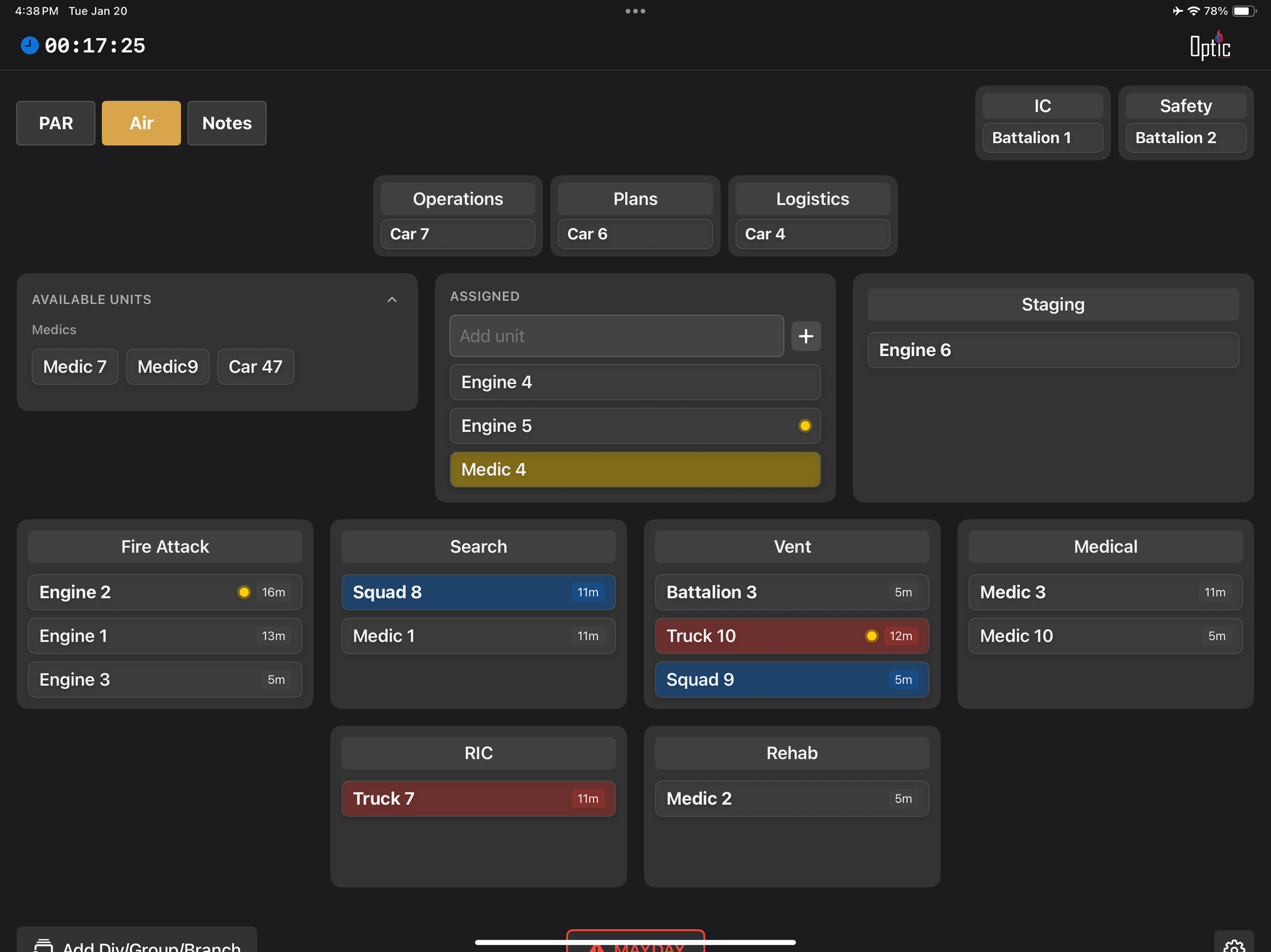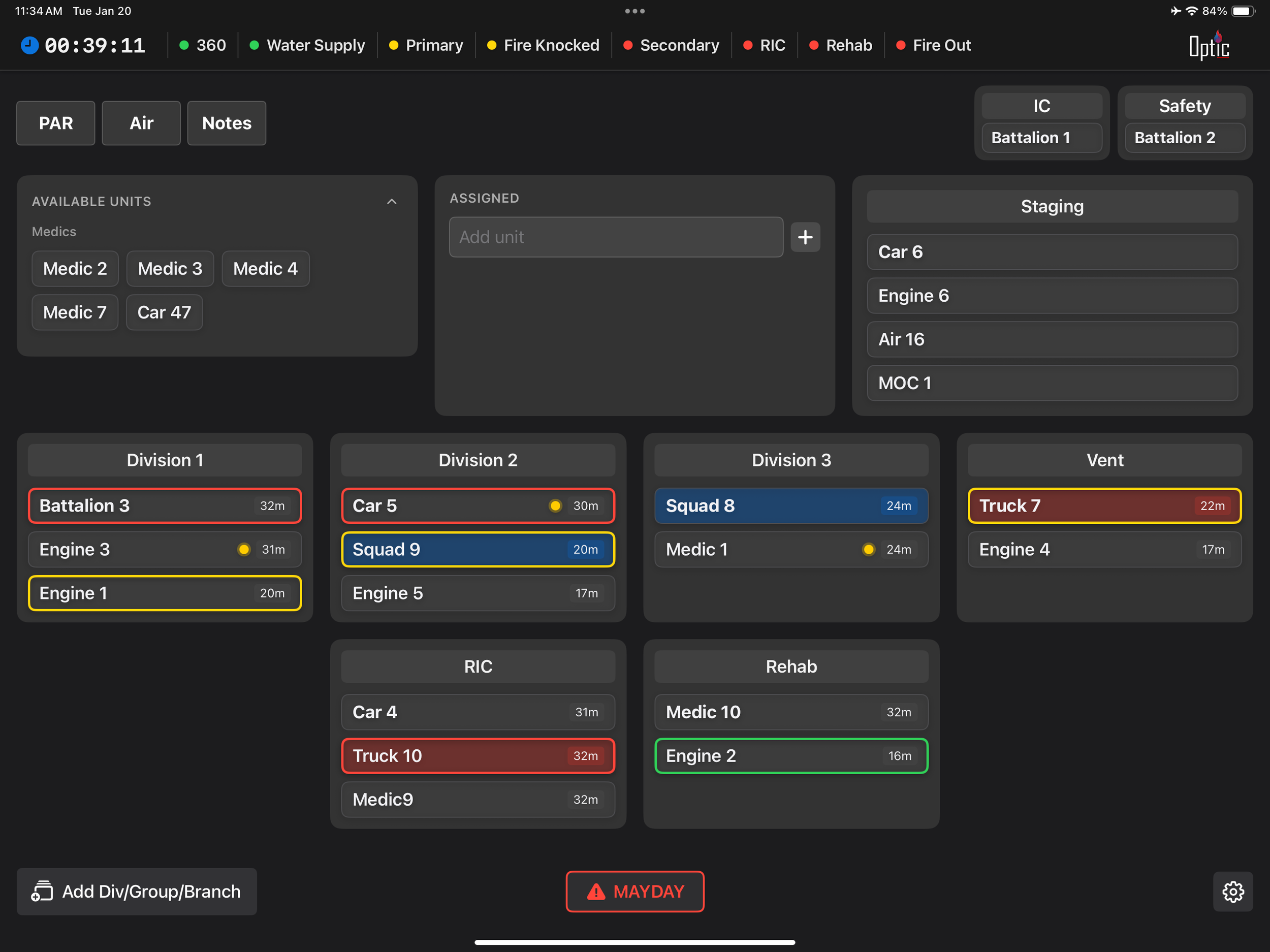 With individual unit timers, incident timers, PAR reminders, Mayday tracking, incident checklists, incident reporting, and more, Optic supports command from the first unit on scene through incident termination.